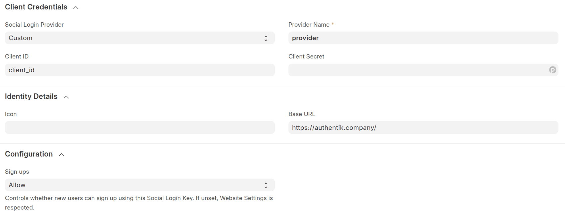 • Redirect URL: https://frappe.company/api/method/frappe.integrations.oauth2_logins.custom/<provider-name> (replace <provider-name> with the name of the provider in Frappe)